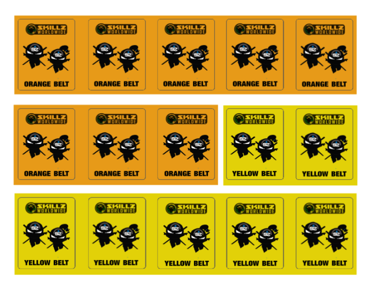 • 1 Belt rank sticker sheet with 15 individual stickers* (3 orange, 3 yellow, 2 green, 2 purple, 2 blue, 1 brown, 1 red, 1 red black)