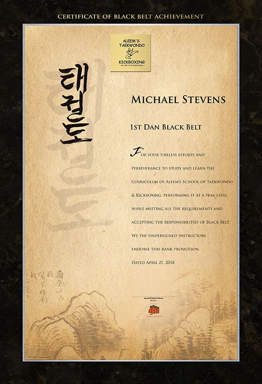 Highest quality vertical 13”x19” Custom Printed Black Belt Certificate, acid-free gallery watercolor paper, double acid-free matting with an outside mat dimension of 18”x24”. 8-10 color printed with gallery level ink, guaranteed not to fade. Your certificates are meticulously handled and professionally packaged for delivery directly to your door. NO Minimum order required!
